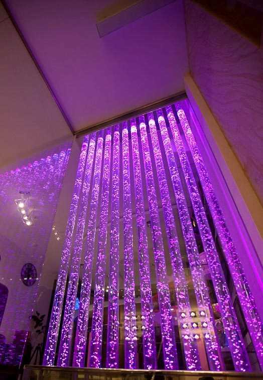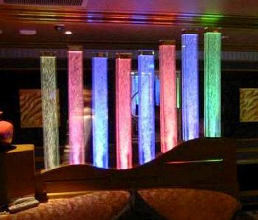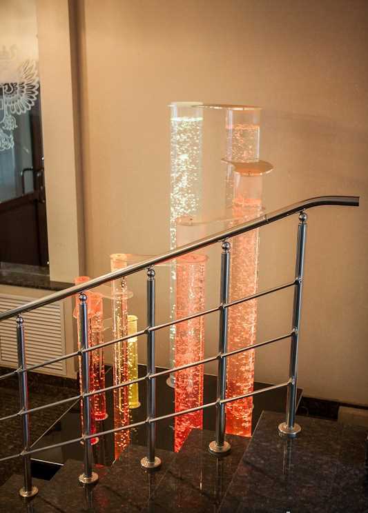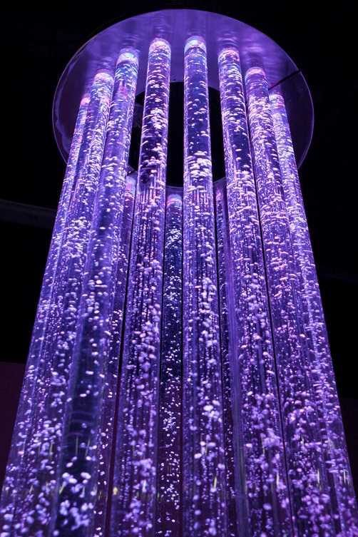 Пузырьковая колонна - используем акриловые трубы, чтобы заполнить резервуар, используем дистилированную воду. Малошумный компрессор, обеспечивает поток пузырьков воздуха, скорость движения которых, а также их размеры и форму, можно регулировать, так как хочется в данный конкретный момент. Сам же блок управления, находится в основании изделия. Колонна устойчива к воздействию механических повреждений.